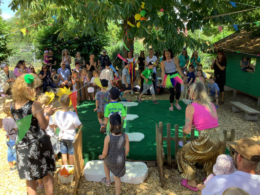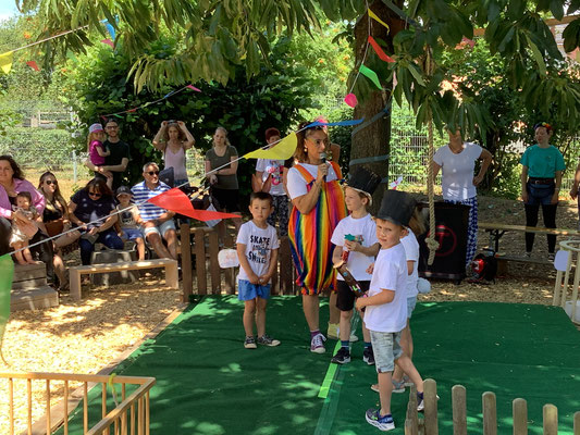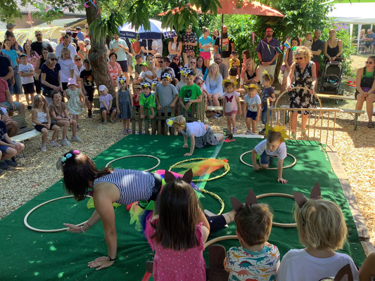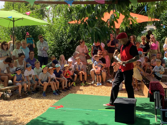 Unser diesjähriges Sommerfest stand unter dem fröhlichen Motto „Willkommen im Zirkus“. Schon im Vorfeld wurde fleißig überlegt, abgestimmt und geplant, um diesen Tag für Groß und Klein unvergesslich zu machen. Kinder und Erzieherinnen trafen sich regelmäßig in Kleingruppen, um ihre Auftritte vorzubereiten und zu proben, die kreativen Ideen dazu stammten ausschließlich von den Kindern selbst.